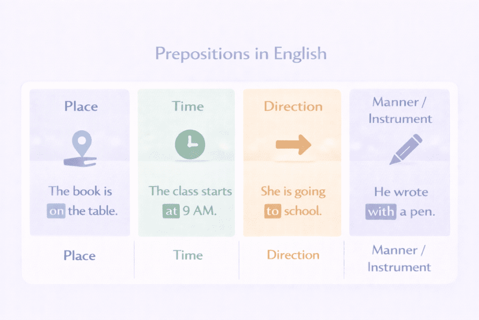 in, on, at, to, from, for, with, about, by, under, over, between, among